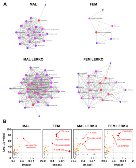 Hepatic ERα contributes to preserve metabolic homeostasis in the liver of females under an excess of dietary lipids. (A) HFD effects on metabolite–metabolite interaction in the liver of control males, control females, LERKO males, and LERKO females. (B) Metabolic impact analysis of the most relevant biological pathways modified by HFD in the livers of control males, control females, LERKO males, and LERKO females identified through integrative analysis of the changes in the expression of key genes and metabolites. The metabolic pathways are represented as circles according to their enrichment (p-value, Y axis) and topology analyses (pathway impact, X axis) using MetaboAnalyst 5.0 software. The color of each metabolic pathway is related to the p-value obtained from enrichment analysis and its size represents the fold enrichment score; darker circle colors indicate more significant changes of metabolites in the corresponding pathway. The size of the circle corresponds to the pathway impact score and is correlated with the centrality of the involved metabolites.