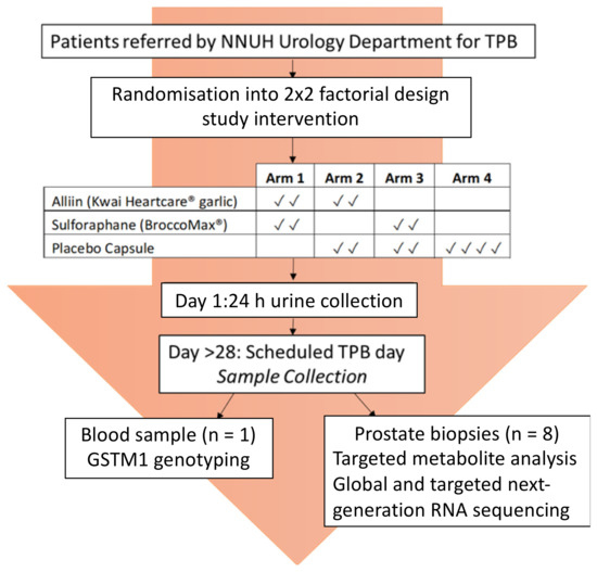 The study was of a randomised, double-blinded, 2 × 2-factorial design, delivering high-dose dietary supplement interventions to men in the pre-biopsy window prior to their trans-perineal prostate biopsy (TPB) (Figure 1). The study design was chosen since it is effective at increasing the power of a study that involves two treatment arms (glucoraphanin and alliin) and a placebo. It assumes that there is no interaction of the two treatments.