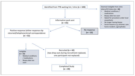 In total, 103 men were identified from the TPB waiting list, of which 65 were deemed eligible and sent a study information pack, and 42 were recruited to the study and randomised to the four arms. A total of 40 participants returned a 24-h urine collection from day one of the study. Participants collected all urine passed following the consumption of four capsules on the morning of day one up until the time of consuming the next day’s capsules. A total of 39 participants underwent TPB of the prostate on the final day (Figure 2, Table 1). All participants who completed the study also completed the CVFFQ and the non-validated allium FFQ on either the day of their biopsy procedure or shortly after.