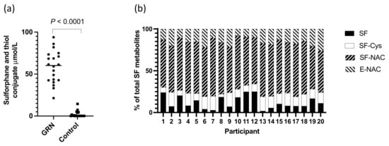 (a) Total level of sulforaphane and thiol conjugates in urine of individuals consuming the GRN supplements or not (control); p-value from a Mann–Whitney test; (b) proportion of sulforaphane and thiol conjugates in urine of participants consuming GRN supplement.