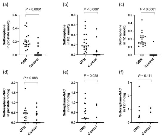 Sulforaphane in (a) prostate, (b) PZ and (c) TZ and sulforaphane-NAC in (d) prostate, and (e) PZ and (f) TZ in prostate following consumption of the GRN supplement or not (control). All p-values are from Mann–Whitney tests.