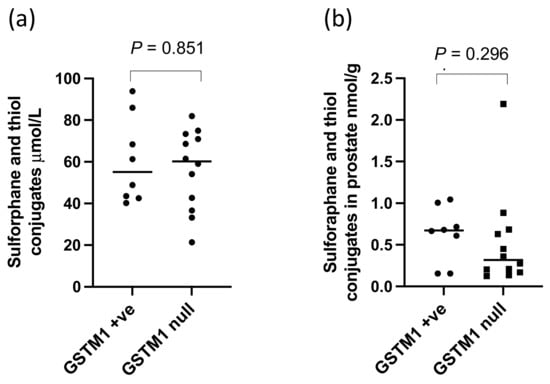Sulforaphane and thiol conjugates in (a) urine and (b) prostate of GSTM1 +ve and null participants following GRN supplementation. p-values are from Mann–Whitney tests.