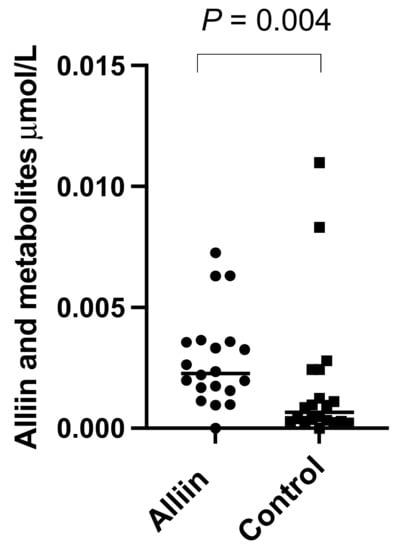 Alliin and associated metabolites in urine of participants consuming alliin supplements or not (control). p-values are from Mann–Whitney test.