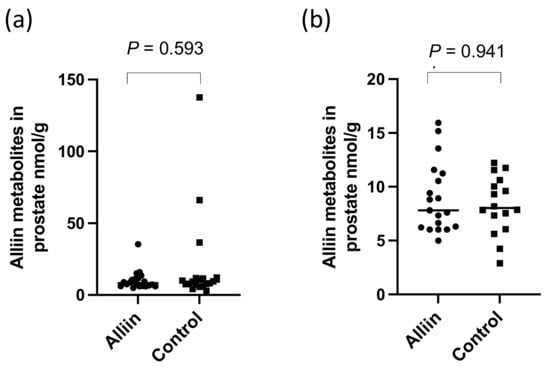 Alliin and associated metabolites in (a) prostate tissue and (b) with outliers removed. p-values are from Mann–Whitney tests.