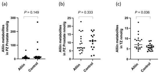 Alliin and associated metabolites in (a) PZ, (b) PZ with outliers removed, and (c) TZ. p-values are from Mann–Whitney tests in prostate following consumption of alliin supplements or not (control).