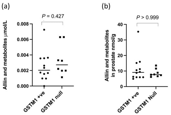 Alliin in metabolites in (a) urine and (b) prostate of GSTM1 +ve and null participants who consumed the alliin supplement. p-values are from Mann–Whitney tests.