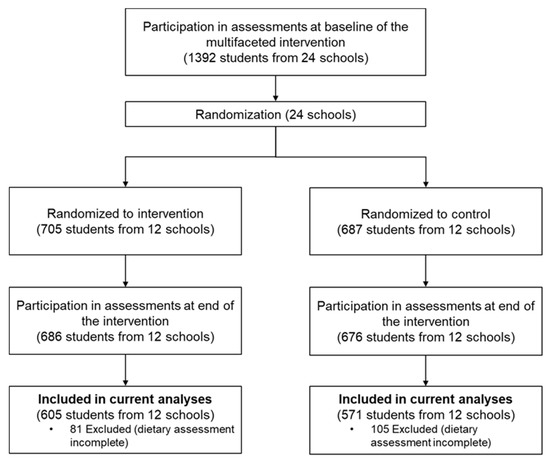 A total of 1176 children who met the inclusion criteria were involved in this study (Figure 1). The children included did not differ from those who were excluded on demographic variables (Table S3). The control group (n = 571) and intervention group (n = 605) had similar sociodemographic characteristics at baseline. There were no significant differences in other characteristics between the two groups (Table 1).