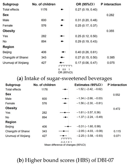 When stratified by sex, obesity status at baseline, and region, we did not observe significant differences of the improvement on the SSB or HBS scores. The effect size did not differ significantly by sex, baseline obesity status, and region. (Figure 2).