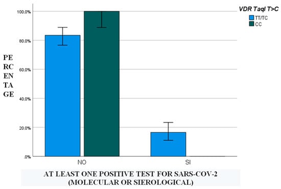 Finally, a binary logistic regression analysis was performed in order to assess which demographic, genetic, pharmacological, clinical and/or hematochemical factors were able to predict the positivity of at least one test: in the univariate regression model, vitamin D levels < 10 ng/mL in the first and third trimesters of pregnancy (p < 0.001 for both), administration of low-molecular-weight heparin (p = 0.04) and CC genotype for the VDR TaqI polymorphism (p < 0.001) were retained. In the multivariate regression, VDR TaqI polymorphism was the only predictor (p < 0.001): in detail, all CC patients showed negativity for every SARS-CoV-2-related test (Figure 1).
