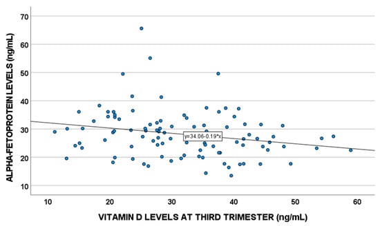 In a sub-population of 118 patients, vitamin D levels were correlated with some pregnancy-related factors, such as alpha-fetoprotein (AFP) levels (p = 0.02, SC = −0.24) (Figure 2).