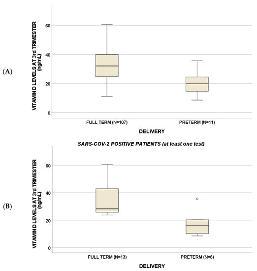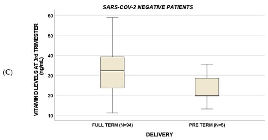 Third-trimester vitamin D levels were lower in preterm births compared to full-term pregnancy (p < 0.001) (A): in particular, a p-value of 0.01 was suggested for positive subjects (B), whereas p = 0.07 for negative women (C). Circles indicate "out" values.