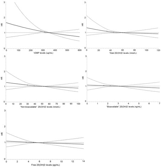 Dose–response curves for the associations of VDBP, total, “non-bioavailable”, “bioavailable”, and free 25(OH)D concentrations with risk of developing diabetes. Curves were derived using restricted cubic splines with three knots at 25, 50, and 75 (as the reference) percentiles of VDBP, total, “non-bioavailable”, “bioavailable”, and free 25(OH)D concentrations. Associations were multivariable-adjusted for age; sex; education; smoking and drinking status; vegetable, fruit, and fish consumption; regular intake of multivitamin supplements; body mass index; hemoglobin A1c; total cholesterol; high-density lipoprotein cholesterol; triglycerides; C-reactive protein; systolic blood pressure; estimated glomerular filtration rate; family history of diabetes; history of cardiovascular diseases and cancer; antihypertensive medication; lipid-lowering medication; and season of blood draw. There were 27 (0.6%) participants with VDBP > 600 µg/mL; 62 (1.3%) with total 25(OH)D > 120 nmol/L; 84 (1.7%) with “non-bioavailable” 25(OH)D > 100 nmol/L; 62 (1.3%) with “bioavailable” 25(OH)D > 7 ng/mL; and 105 (2.2%) with free 25(OH)D > 14 pg/mL.