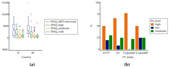 Figure 1. (a) Level of physical activity in Italians and Spaniards according to International Physical Activity Questionnaire (IPAQ); (b) prevalence of subjects who consume fruit and vegetables in relation to physical activity level. PA: physical activity; no FV: no consumption of fruit and vegetables (0 point for subscores F-QueMD and V-QueMD); FV: daily consumption of at least four servings of fruit and vegetables (1 point for F-QueMD and V-QueMD); F-QueMD: daily intake of at least two servings of fruit (1 point for F-QueMD and 0 point for V-QueMD); V-QueMD: daily consumption of at least two servings of vegetables (1 point for V-QueMD and 0 point for F-QueMD). Different colors of circles, squares and crosses represent the single values that deviate from the mean for each group of physical activity level.
