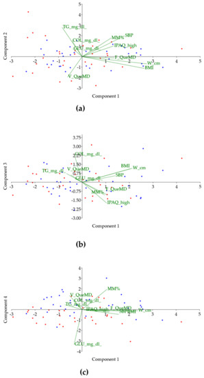 Figure 3. Principal component analysis (PCA). (a) Component 1 (PC1) vs. Component 2 (PC2); (b) Component 1 (PC1) vs. Component 3 (PC3); (c) Component 1 (PC1) vs. Component 4 (PC4). Italians and Spaniards are represented by blue and red points, respectively. TG: triglycerides; COL: cholesterol; GLU: glucose; %MM: muscle mass percentage; SBP: systolic blood pressure; IPAQ high: IPAQ from high intensity activities according to International Physical Activity Questionnaire; F-QueMD: subscore of QueMD representing score 0–1 (1 point for at least two servings of fruit); V-QueMD: subscore of QueMD representing score 0–1 (1 point for at least two servings of vegetables); W: waist circumference; BMI: body mass index.