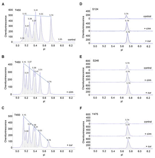 Cinnamaldehyde and curcumin increase pan-Akt phosphorylation. (A–C) Distribution of p-Akt (T450) as a function of isoelectric points in (A) untreated control preadipocytes or (B,C) preadipocytes treated with (B) cinnamaldehyde or (C) curcumin. The dashed line highlights the distribution trend. (D–F) Distribution of (D) p-Akt (S124), (E) p-Akt (S246), and (F) p-Akt (Y475) in untreated control preadipocytes (top electropherogram), or preadipocytes treated with cinnamaldehyde (middle electropherogram) or curcumin (bottom electropherogram).