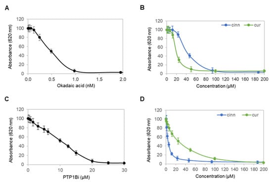 Cinnamaldehyde and curcumin are known inhibitors of protein serine/threonine phosphatase 2A (PP2A) and protein tyrosine phosphatase 1B (PTP1B) [,]. Next, enzymatic activities of recombinant PP2A and PTP1B proteins were measured in the presence of cinnamaldehyde and curcumin and compared to okadaic acid, a known PP2A inhibitor [], and a PTP1B inhibitor (PTP1Bi) []. Okadaic acid inhibited PP2A with a half-maximal inhibitory concentration (IC50) of approximately 0.5 nM (Figure 6A). By comparison, cinnamaldehyde and curcumin inhibited PP2A with IC50 values of approximately 40 and 20 µM, respectively (Figure 6B). Expectedly, PTP1Bi inhibited PTP1B at an IC50 of approximately 10 µM (Figure 6C). By comparison, cinnamaldehyde and curcumin inhibited PTP1B at an IC50 of approximately 4 and 25 µM, respectively (Figure 6D). Taken together, cinnamaldehyde and curcumin inhibited both PP2A and PTP1B.