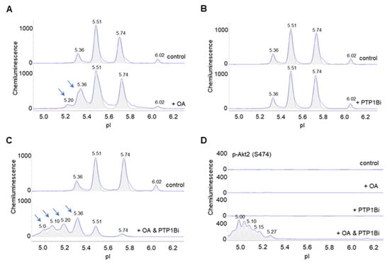 Lastly, the effects of okadaic acid and PTP1Bi on Akt2 were examined in primary human subcutaneous preadipocytes. On the one hand, okadaic acid treatment induced the appearance of a new Akt2 isoform at pI 5.20 and increased the abundance of an existing Akt2 isoform at pI 5.36 versus the untreated control (Figure 7A). On the other hand, PTP1Bi treatment had no observable effect on the cIEF electropherogram of Akt2 versus the untreated control (Figure 7B). Surprisingly, combined okadaic acid and PTP1Bi treatment strongly induced the appearance of multiple Akt2 isoforms at low pI values from 4.90 to 5.20 (Figure 7C). Neither okadaic acid nor PTP1Bi treatment individually was capable of inducing p-Akt2 (S474) expression. In contrast, combined okadaic acid and PTP1Bi treatment strongly induced the expression of p-Akt2 (S474) (Figure 7D). Notably, the combined okadaic acid and PTP1B treatment activated Akt2 in the absence of insulin.