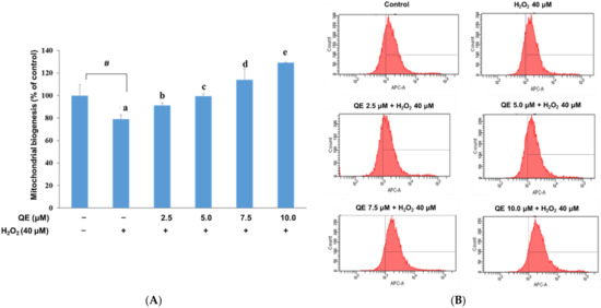 Effects of quercetin on mitochondrial biogenesis following H2O2-induced oxidative stress in the SH-SY5Y cells. (A) Quantitative results of mitochondrial biogenesis in each group according to (B). (B) Representative profiles of the mitochondrial biogenesis detected by flow cytometry using Mito Tracker Red FM. The SH-SY5Y cells were incubated with 40 μM H2O2 for 24 h after the addition of 2.5, 5.0, 7.5, and 10.0 μM quercetin for 24 h. Data were presented as mean ± SD. # Data are analyzed using an independent t-test and are significantly different from the control group. Bars of 0, 2.5, 5.0, 7.5, and 10.0 μM quercetin with different letters significantly differ. Statistical analysis was performed using a one-way ANOVA, followed by a least significant difference post hoc test (n = 3).