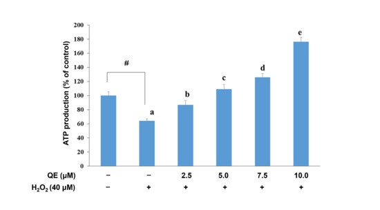 Effects of quercetin and H2O2 on cellular ATP production. Data were presented as mean ± SD. # Data are analyzed using an independent t-test and are significantly different from the control group. Bars of 0, 2.5, 5.0, 7.5, and 10.0 μM quercetin with different letters significantly differ. Statistical analysis was performed using a one-way ANOVA, followed by a least significant difference post hoc test (n = 3).
