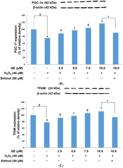 Effects of quercetin and H2O2 on SIRT1 (A), PGC-1α (B) and TFAM (C) protein expression. Data were presented as mean ± SD. # Data are analyzed using an independent t-test and are significantly different from the control group. * Data are analyzed using an independent t-test and are significantly different from the group added 10 μM quercetin but without sirtinol. Bars of 0, 2.5, 5.0, 7.5, and 10.0 μM quercetin with different letters significantly differ. Statistical analysis was performed using a one-way ANOVA, followed by a least significant difference post hoc test (n = 3).