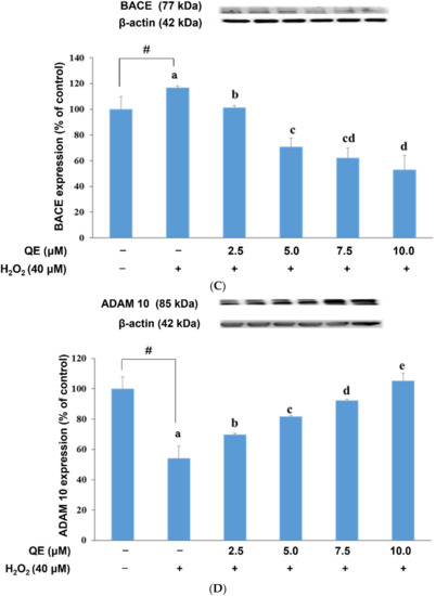 We examined the influence of QE on APP, Aβ, BACE, and ADMA-10 expression in the SH-SY5Y cells with H2O2-induced oxidative stress (Figure 5). APP expression was significantly increased in these cells; however, QE reduced the APP expression levels (Figure 5A). Similar results were observed for Aβ expression, signifying that QE might reduce APP expression and subsequently engender the reduction in Aβ expression (Figure 5B). QE also reduced BACE expression significantly (Figure 5C) but increased ADMA-10 expression (Figure 5D).
