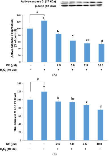 Effects of quercetin on H2O2-induced changes in cell apoptosis. (A) Western blot analysis of active-caspase 3 expression in SH-SY5Y cells. (B) Percentages of apoptotic cells in each group quantified from (C). (C) Representative profiles of cell apoptosis detected by flow cytometry with Annexin V/propidium iodide double-staining. The cells were cultured with 0.0, 2.5, 5.0, 7.5 and 10.0 μM of quercetin for 24 h and then treated with 40 μM of H2O2 for 24 h. Data were presented as mean ± SD. # Data are analyzed using an independent t-test and are significantly different from the control group. Bars of 0, 2.5, 5.0, 7.5, and 10.0 μM quercetin with different letters significantly differ. Statistical analysis was performed using a one-way ANOVA, followed by a least significant difference post hoc test (n = 3).