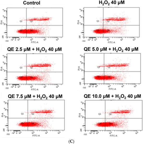 Cell apoptosis and caspase-3 activation have been implicated in the pathogenesis of AD. Upregulation of proapoptotic proteins and DNA fragmentation were also observed previously in the AD brain [58]. Accordingly, we examined the neuroprotective effect of QE on active caspase-3 expression in, and the apoptosis of, SH-SY5Y cells with H2O2-induced oxidative stress. Our results revealed that QE significantly reduced the expression of active caspase-3 in these cells (Figure 6A) in a dose–response trend as well as in reducing cell apoptosis (Figure 6B,C). At a concentration of 7.5 µM or above, the effect of QE did not show a statistical difference as the concentration went up. These results indicate that QE could inhibit the cell apoptosis due to the oxidative effect from H2O2.