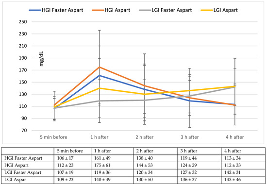 In some trials, Faster Aspart has been associated with a slightly increased risk of symptomatic hypoglycemia within the first two hours after a meal [25,27,29,32]. In our study, no severe hypoglycemia occurred, and non-severe symptomatic hypoglycemic episodes were infrequent following both test meals (HGI meal: 3/25, 12%; LGI meal: 5/25, 20%), with no differences between the two insulin analogs.