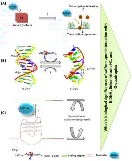 Interplay of saffron with different biomolecules. (A) Interaction of saffron with linker histone H1. (B) Saffron binds to double-stranded B-DNA minor groove and converts to C-DNA conformations. (C) Saffron binds and stabilizes the G-quadruples structure of DNA. The biological consequences of the interplay of saffron with H1, B-DNA, and G-quadruples have not been studied, A–blue, C–yellow, G–green, T–red.