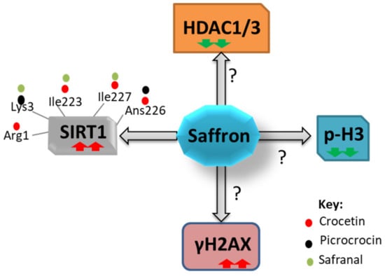 Modulation of epigenetic factors upon treatment with saffron. Saffron interacts with SIRT1 at different residues and augments its activity; also, saffron alters the expression of HDAC1/3, pan-H3 phosphorylation (p-H3), and γH2AX by an unknown mechanism. Red arrow depicts high, and the green represents low levels of expression.