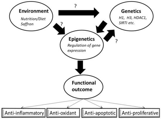 Interplay of environmental factors with genetics and epigenetics. Interaction of dietary components such as saffron and its bioactive ingredients impact several genes directly or indirectly via epigenetic mechanisms, resulting in many outcomes. How saffron alters the epigenomic landscape is still a big puzzle that needs further study in the future.