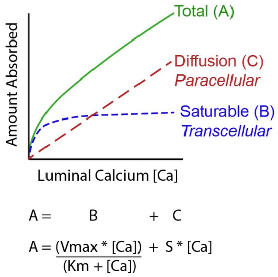 A Mathematical model of intestinal calcium (Ca) absorption. By studying Ca absorption over a range of luminal Ca levels it has been shown that the total amount of Ca absorbed across the intestinal barrier can be described as a curvilinear function. Total transport (A) is the sum of a saturable component (likely transcellular, B) that can be defined by the Michaelis–Menten equation and a diffusional process (C) that is defined by a straight line. [Ca] = luminal Ca concentration; S = the slope of the diffusional component; Vmax = the maximum transport rate seen for the saturable transport component; Km = the luminal concentration of the mineral at ½ the Vmax.