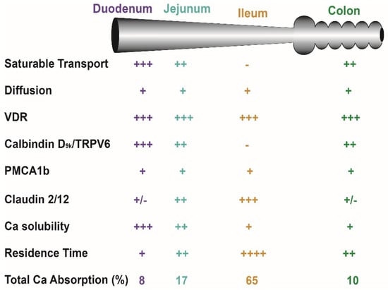 Critical factors that influence intestinal calcium (Ca) absorption. Many factors influence net Ca absorption and distinct Ca absorption mechanisms used in various intestinal segments. See Bronner and Pansu [38] for a discussion of solubility and transit time as factors affecting Ca absorption. The number of “+” signs reflects the magnitude of the parameter across tissues while a “-” sign indicates that the parameter is absent in a segment.