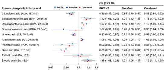 Associations of genetically predicted circulating levels of fatty acids with risk of venous thromboembolism. CI indicates confidence interval; INVENT, the International Network Against Venous Thrombosis; OR, odds ratio. The associations were scaled to one standard deviation increment in genetically predicted circulating levels of fatty acids.