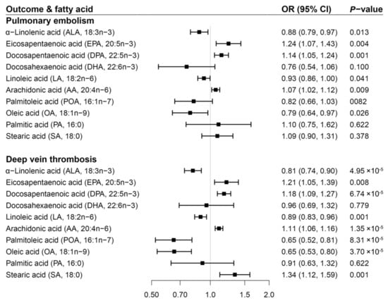 With respect to diet, recent observational studies have suggested that dietary intake of polyunsaturated n-3 fatty acids is associated with the risk of onset and reoccurrence of VTE [6,7]. A randomized controlled trial also observed that the group with daily supplementation of omega-3 fatty acids had a lower risk of PE and symptomatic DVT compared to the control group after surgery among patients with proximal femoral fractures [8]. Nevertheless, different individual polyunsaturated n-3 fatty acids may have varying effects on thrombosis and cardiovascular health [9]. Animal studies found that plant-derived α-linolenic acid (ALA) belonging to n-3 fatty acids was against arterial thrombus formation [10,11], tissue factor expression, and platelet activation [11]. The effect of ALA on platelet phospholipids was also observed in vegetarian men [12]. However, another n-3 fatty acid, docosahexaenoic acid (DHA), was not found to be associated with physiological changes in blood coagulation, platelet aggregation, or thrombotic tendencies among healthy adult males [13]. Other fatty acids, such as arachidonic acid (AA) [14], ratio of oleic to palmitic acid (PA) [15], and stearic acid (SA) [16], were also associated with thrombotic features and biomarkers. Nonetheless, few population-based studies have examined the associations between other individual fatty acids, such as palmitoleic acid (POA,) and risk of VTE. In addition, the majority of previous evidence was based on observational studies where the associations were likely to be biased by confounding and reverse causation. Thus, the causality of the associations of fatty acids with risk of VTE remains unclear and entangled.