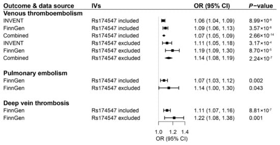 For AA, the associations with VTE, PE, and DVT were consistent in the sensitivity analysis based on the supplemental genetic instrument including and excluding rs174547 in the FADS1/2 gene region (Figure 4). Notably, the magnitude of the associations became stronger, albeit with wider CI after excluding rs174547 (combined OR for VTE, 1.14; 95% CI 1.08–1.19; OR for PE, 1.14; 95% CI 1.00–1.30; OR for DVT, 1.22; 95% CI 1.08–1.38). The associations for POA and AA proxied by the supplemental genetic instrument were overall consistent in the sensitivity analyses. We observed evidence of potential horizontal pleiotropy in the associations of genetically predicted levels of POA with risk of VTE and DVT in FinnGen (Supplementary Table S8).