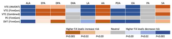 Summary of associations of genetically predicted levels of ten fatty acids with risk of venous thromboembolism and subtypes after correction for multiple testing. AA indicates arachidonic acid; ALA, α-linolenic acid; DHA, docosahexaenoic acid; DPA, docosapentaenoic acid; DVT, deep vein thrombosis; EPA, eicosapentaenoic acid; FA, fatty acid; LA, linoleic acid; INVENT, the International Network Against Venous Thrombosis; OA, oleic acid; PA, palmitic acid; PE, pulmonary embolism; POA, palmitoleic acid; SA, stearic acid; VTE, venous thromboembolism.