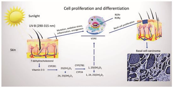 Vitamin D metabolism and cutaneous synthesis. Under exposure to UVB rays, the process of vitamin D3 synthesis proceeds in keratinocytes, which contain CYP enzymes necessary for the photochemical conversion of the precursor of vitamin D3, 7-dehydrocholesterol, into its active form (calcitriol 1, 25(OH)2D2). The activities of hydroxyderivatives of vitamin D are mediated by the involvement of the ligand-binding domain of the nuclear receptor, VDR. Furthermore, vitamin D3 is implicated in the regulation of biological functions and gene expression of keratinocytes of both healthy and BCC-affected subjects, mediated by the presence of ROR α and γ nuclear receptors. Abbreviations: UVB, ultraviolet B; VDR, vitamin D receptor; RORα and γ, retinoic acid-related orphan receptors α and γ; BCC, basal cell carcinoma.