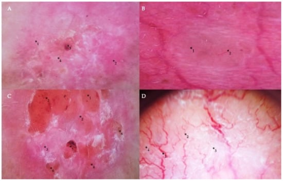Dermoscopic findings in different types of BCC. (A) Milky-pink color structureless areas (*1), pink homogeneous areas (*2), short thin telangiectasia (*3), and erosion (*4) on the central part of the tumor in the case of superficial BCC. (B) A translucent nodule (*1) raised above the skin and arborizing vessels (*2) in nodular BCC. (C) The nodular appearance of a tumor with a border raised above the central part of the lesion (*1), arborizing and short thin telangiectasias (*2), milky-pink (*3) and milky-red color structureless areas (*4), ulceration (*5), and erosion (*6) in the case of micronodular BCC. (D) Arborizing vessels (*1), short thin telangiectasia (*2) on shiny white (*3) and milky-red structureless areas (*4) in the infiltrative and mixed type of BCC.