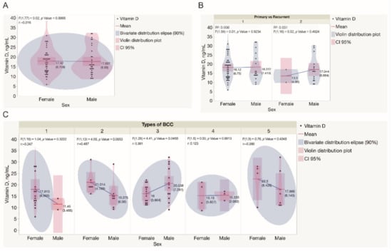 Assessment of serum vitamin D levels in the study cohort. (A) Assessment of serum vitamin D levels in males and females recruited in the study. Each dot represents a single data point. (B) Assessment of serum vitamin D levels in males and females presented with either primary or recurrent BCC tumors. Each dot represents a single data point. (C) Assessment of serum vitamin D levels in males and females presented with different types of BCC tumors. Each dot represents a single data point. Statistically significant differences in serum vitamin D levels were not observed when different types of BCC diagnosed in both genders were compared, except in mixed BCC tumors, diagnosed in females presented with significantly lower serum vitamin D levels when compared to males (p = 0.0456). Abbreviations: (B) 1—primary BCC tumors; 2—recurrent BCC tumors; (C) 1—superficial BCC tumors; 2—nodular BCC tumors; 3—mixed BCC tumors; 4—micronodular BCC tumors; 5—infiltrative BCC tumors.