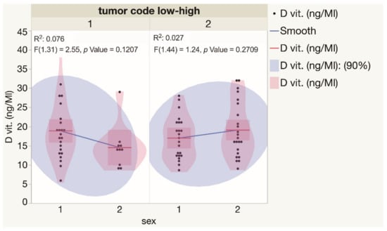 Assessment of serum vitamin D levels in males and females presented with low and high risk BCCs. Each dot represents a single data point. Abbreviations: 1—low-risk BCC tumors; 2—high-risk BCC tumors.