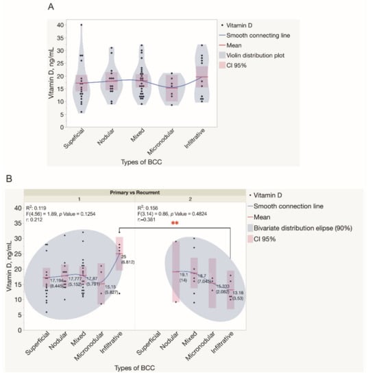 Assessment of serum vitamin D levels in patients presented with different types of BCC tumors. (A) Violin distribution plots depict the results of the assessment of serum vitamin D levels in patients presented with different types of BCC tumors. Each dot represents a single data point. (B) The results of the assessment of serum vitamin D levels in patients presented with either primary or recurrent BCC tumors. Each dot represents a single data point. Abbreviations: (B) 1—primary BCC tumors; 2—recurrent BCC tumors. ** p < 0.01.