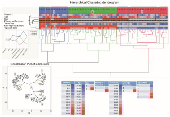 A dendrogram shows hierarchical clustering—relationships between sets of data. The dendrogram consists of stacked branches (clades) that break down into further smaller branches. At the lowest level, individual elements appear and then they are grouped according to attributes into clusters with fewer and fewer clusters on higher levels. The end of each clade (a leaf) are the data. The sets of data included assessments of serum vitamin D level patterns of 79 subjects presenting with the different types of BCC, information about a patient age and sex, a tumor type (primary vs. recurrent), and a type of BCC, and seen in the right lower part of the Figure. The tumor specimens were divided into five subtypes based on differences in histopathology and dermoscopic imaging. The three major data clusters with 2–3 subclusters each are highlighted in the constellation plot of the dendrogram depicted in the left lower part of the Figure. Abbreviations: sex: 1—females; 2—males; primary vs. recurrent BCC: 1—primary BCC; 2—recurrent BCC; low and high-risk BCC: 1—low risk BCC; 2—high risk BCC; types of BCC: 1—superficial BCC tumors; 2—nodular BCC tumors; 3—mixed BCC tumors; 4—micronodular BCC tumors; 5—infiltrative BCC tumors.
