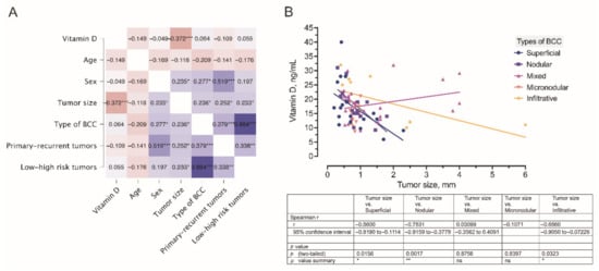 (A) A correlogram of the studied variables. In this plot, correlation coefficients are colored according to the value. Positive correlations are displayed in blue, whereas negative correlations are in red. Color intensity is proportional to the correlation coefficients. The negative association (r = −0.372) between the tumor size and serum vitamin D level is marked by a dark red color. (B) Correlation between the tumor size and serum vitamin D level was observed in different types of BCC. * p < 0.05; ** p < 0.01; *** p < 0.001.