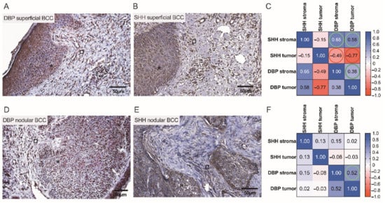 Assessment of cutaneous DBP and SHH expression in low risk BCCs by the use of IHC. Representative images demonstrating cutaneous structures (tumoral (⁎) and stromal (□)) decorated by the anti-DBP (A,D) and anti-SHH (B,E) antibodies and recognized by the presence of brown reaction products found in the BCC samples. Scale bars: 50 μm. Correlograms that highlight associations between the expression of DBP and SHH in superficial (C) and nodular (F) BCCs. A strong negative correlation between SHH and DBP expressions is marked by red color (C).