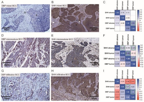 Assessment of cutaneous DBP and SHH expression in high risk BCCs by the use of IHC. Representative images demonstrating cutaneous structures (tumoral (⁎) and stromal (□)) decorated by the anti-DBP (A,D,G) and anti-SHH (B,E,H) antibodies and recognized by the presence of brown reaction products found in the BCC samples. Scale bars: 50 μm. Correlograms that highlight associations between the expression of DBP and SHH in mixed (C), micronodular (F), and infiltrative (I) BCCs. A negative correlation between SHH and DBP expressions is marked by red color (I).