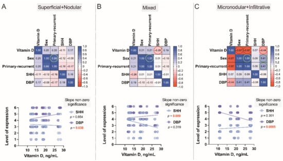 Correlograms of the studied variables, Superficial+Nodular (A), Mixed (B) and Micronodular+Infiltrative (C). The correlograms depict the complex associations between serum vitamin D level patterns of 79 subjects presenting with the different types of BCC and the cutaneous tissue expression of vitamin D binding protein (DBP) and Sonic Hedgehog (SHH) confirmed by the use of IHC in these individuals. Each dot represents a single data point. The levels of expression are assessed as a sum of the tumoral and stromal BCC tissue indices. In these plots, correlation coefficients are colored according to the value. Positive correlations are displayed in blue, whereas negative correlations are in red. Color intensity is proportional to the correlation coefficients.