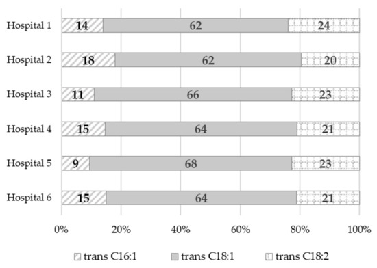 Trans fatty acids content ranged from 0.08% wt/wt (dinner in Hospital 1) to 2.35% wt/wt (afternoon snack in Hospital 4). The highest amounts of TFAs were found in the afternoon snack samples, ranging from 1.56% wt/wt to 2.35% wt/wt, followed by the breakfast samples, ranging from 1.22% wt/wt to 1.89% wt/wt. Dinner samples, on the other hand, had the lowest TFAs content, ranging from 0.08% wt/wt to 1.43% wt/wt. It should be noted that, in most of the dinner samples (more than 80%), the TFAs content was below 1% wt/wt. The greatest variation in the TFAs content was found in the elevenses and supper samples, ranging from below the limit of quantification (LOQ = 0.01% wt/wt) to 2.24% wt/wt and from 0.22% wt/wt to 1.63% wt/wt, respectively. Among the TFAs, trans isomers of oleic acid (trans C18:1) predominated, accounting for 62% (Hospital 2) to 68% (Hospital 5) of all the identified trans fatty acids (Figure 1), followed by trans isomers of linoleic acid (trans C18:2 n-6), accounting for from 20% (Hospital 2) to 24% (Hospital 1) of all the trans fatty acids. Trans isomers of palmitoleic acid (trans C16:1) were also identified. They accounted for 9% (Hospital 5) to 18% (Hospital 2) of all the TFAs.