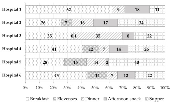 Dinners provided the most fat (Me = 21.5 g), followed by suppers (16.8 g), and breakfasts (14.8 g). The energy value of both the whole-day diet and individual meals also varied between hospitals. The median energy value of the whole-day hospital diet was 2176 kcal, ranging from 1793 kcal (Hospital 5) to 2940 kcal (Hospital 3). Dinners were characterized by the highest energy value (Me = 697 kcal) and afternoon snacks the lowest (Me = 145 kcal).