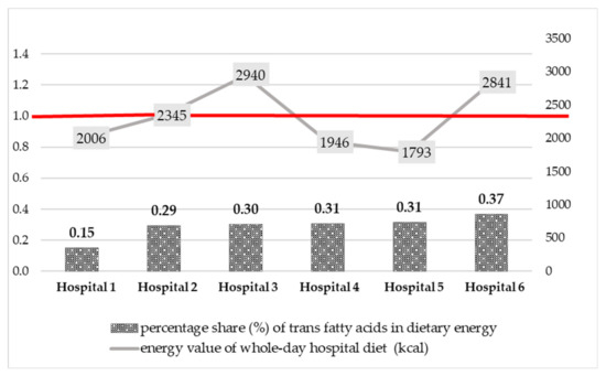 Data on the trans fatty acids intake with the whole-day hospital diets were compared with the Food and Agriculture Organization (FAO)/World Health Organization (WHO) recommendation [40]—less than 1 percent of daily energy intake (1 E%). The results obtained are shown in Figure 3. Trans fatty acids provided from 0.15 (Hospital 1) to 0.37% (Hospital 6) of energy derived from the whole-day hospital diets. The percentage share of TFAs in total dietary energy did not exceed 1 E% and was in line with the recommendations by WHO.